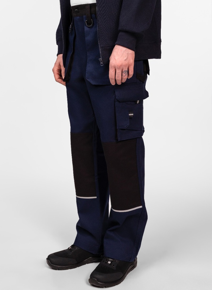 Krytyczne miejsca – kolana oraz tylna część spodni – zostały wzmocnione dodatkową warstwą materiału, co zwiększa ich trwałość i odporność na przetarcia. Podwójne szwy wzmacniają całą konstrukcję, a elementy odblaskowe poprawiają widoczność pracownika w warunkach ograniczonego oświetlenia.